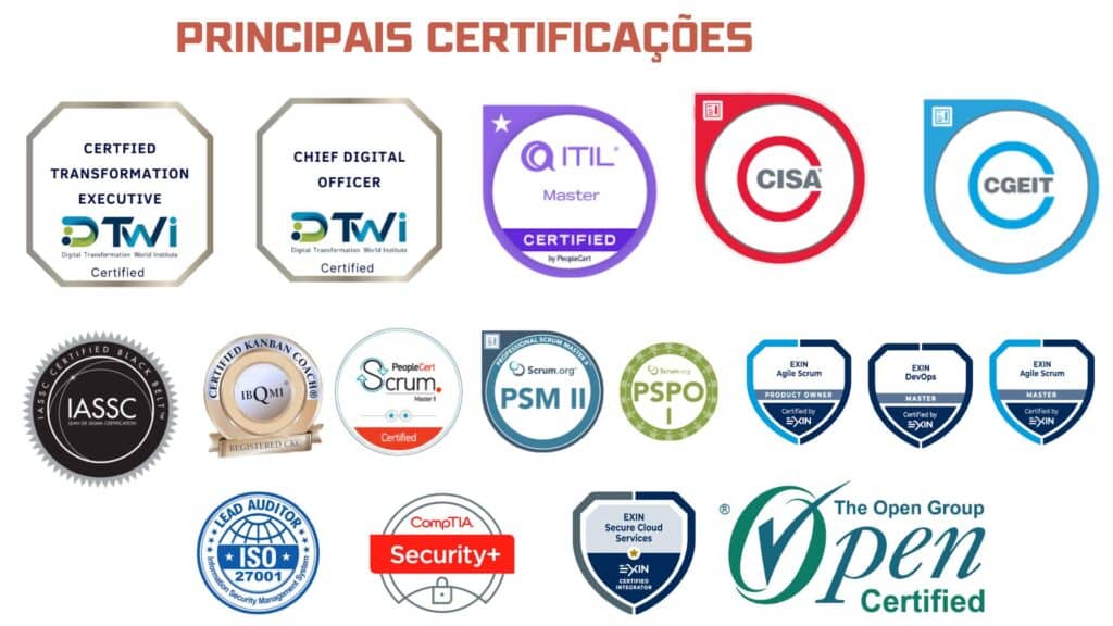 Possui diversas certificações profissionais internacionais em transformação estratégica digital, gestão, governança, estratégia, segurança, agilidade, dentre outros.